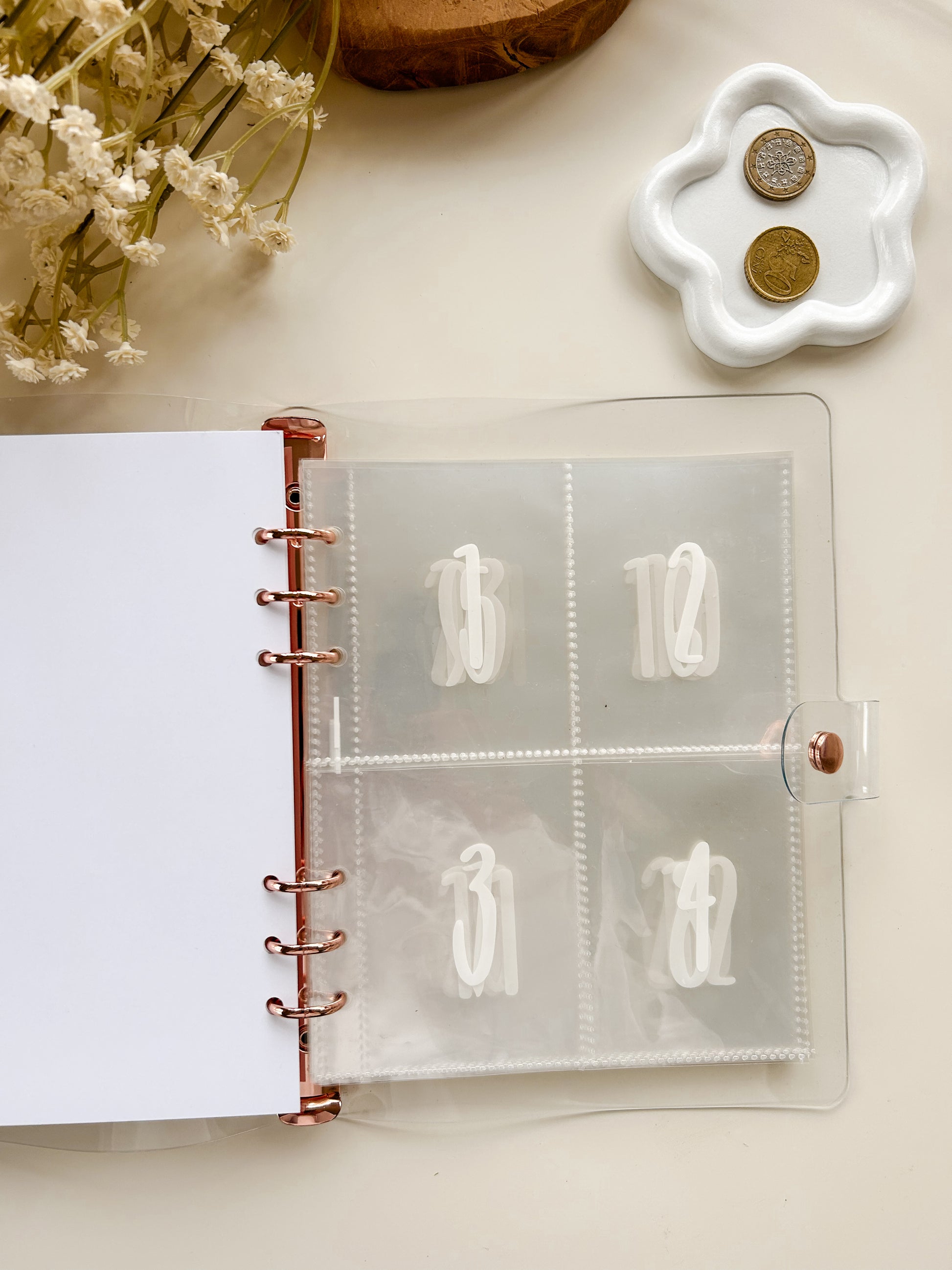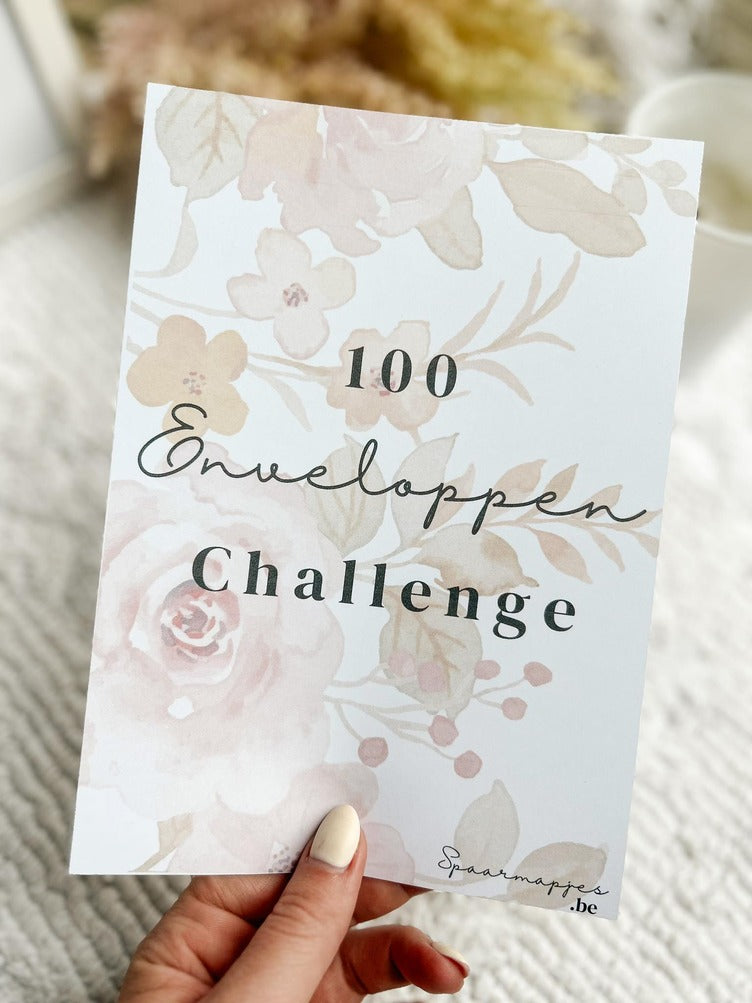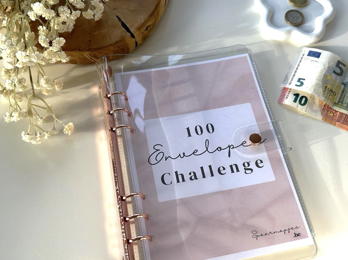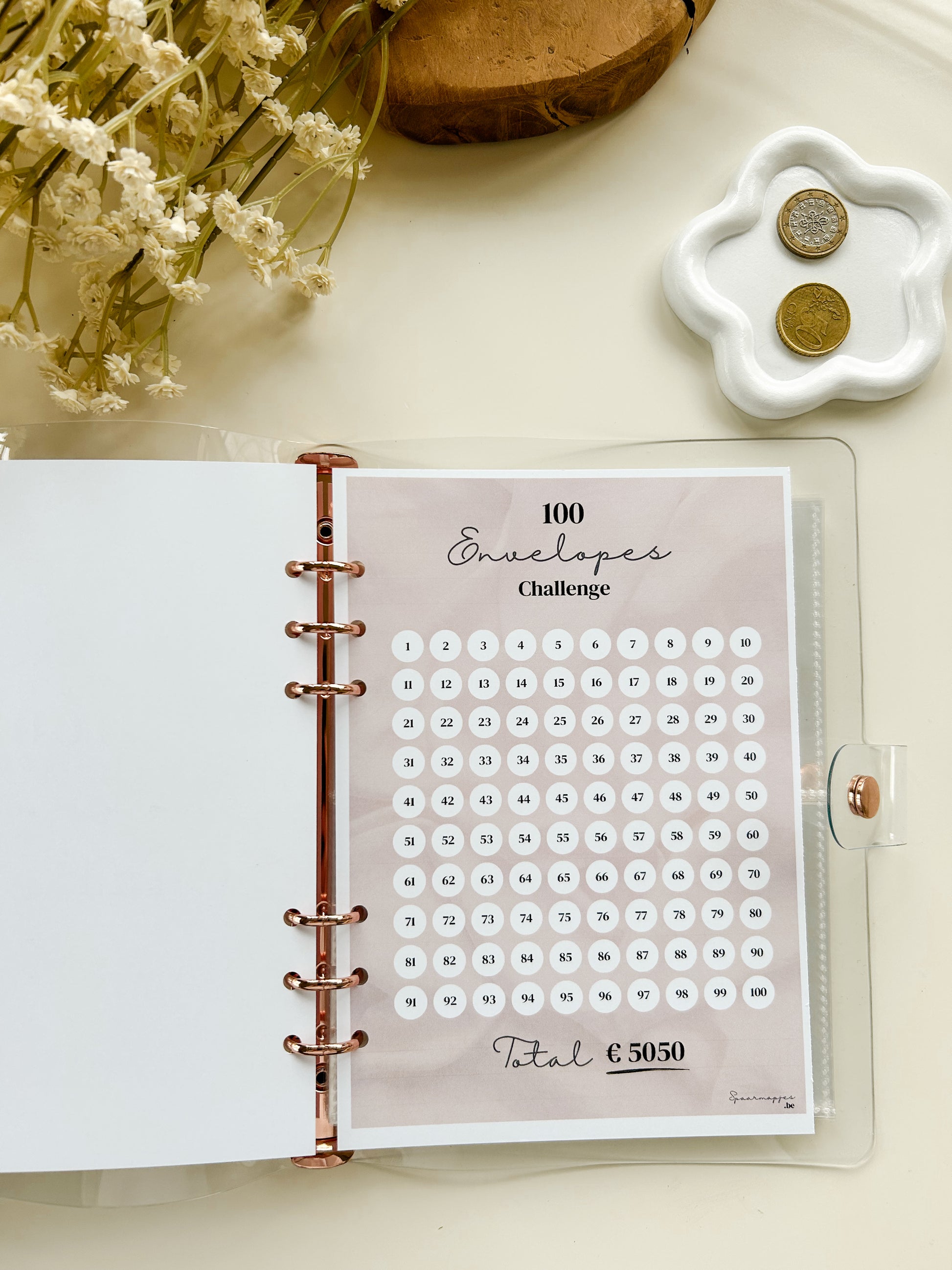 Rose gold mapje, voorblad, genummerde challenge, twee trackers met ruimte voor 100 vermeldingen en 24 bladen met telkens 4 envelopjes genummerd van 1 te.m. 100.