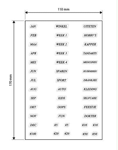 Wil je budgetteren? Kies 6 budgetstickers en plak ze op je tabbladen. Elke maand bereken je hoeveel je cash in dit mapje kan stoppen (en als je wil, volg je je uitgaven op). Je mag natuurlijk steeds een priveberichtje sturen voor meer uitleg.