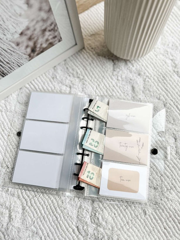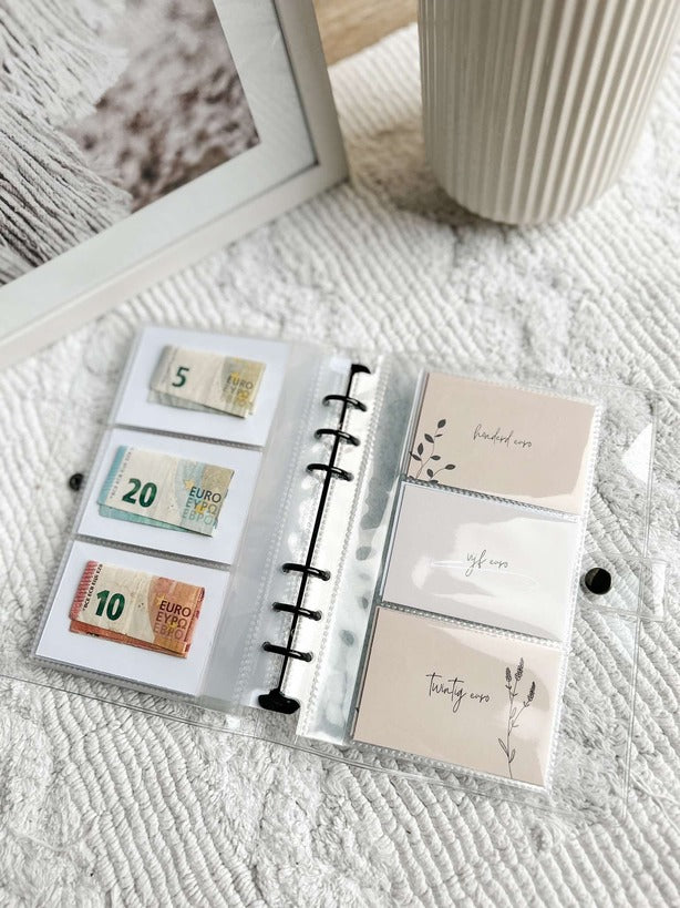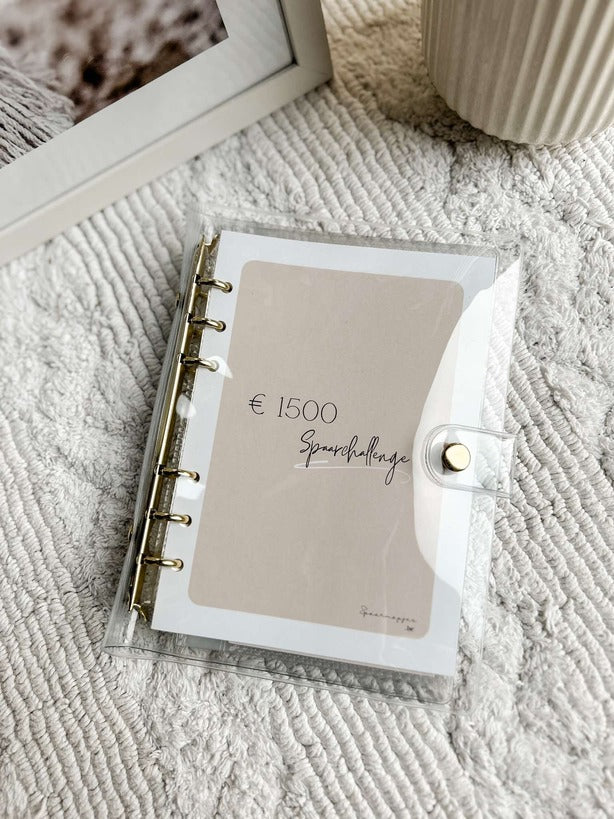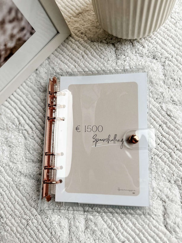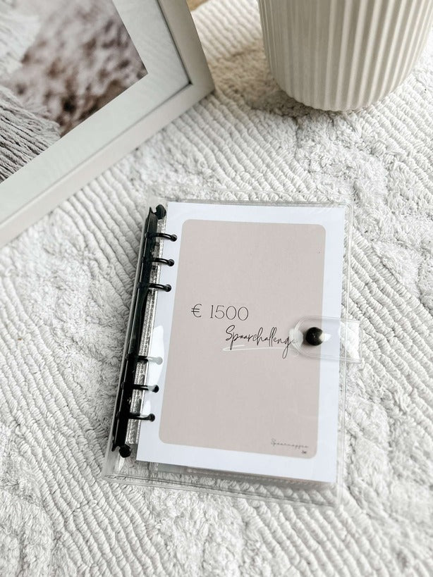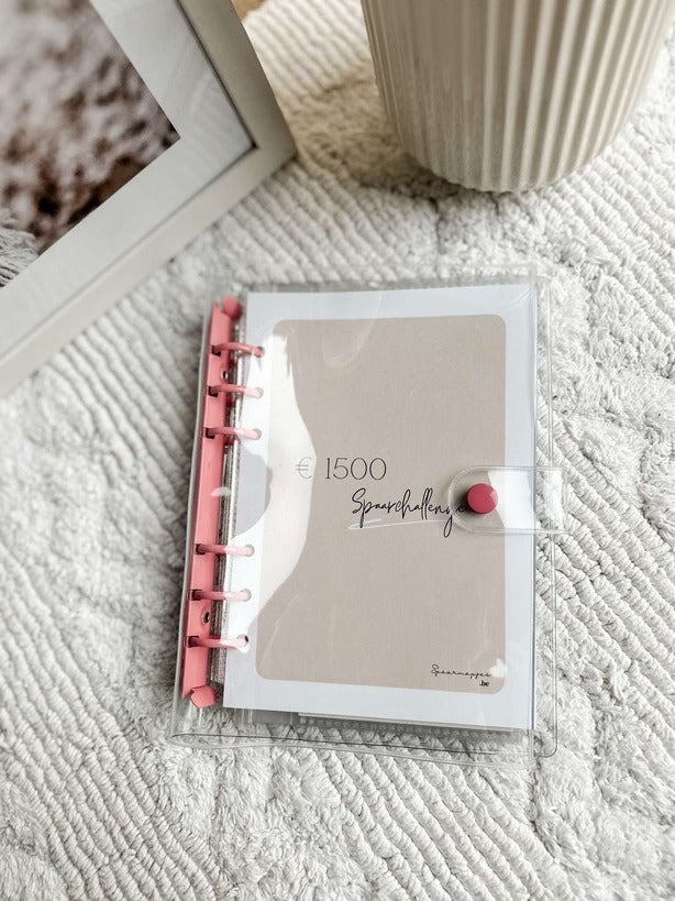 Een A6 map met de €1500 Challenge (kleur te kiezen), 1 voorblad, 10 bladen met 30 vakjes en 30 voorgedrukte kaartjes met de bedragen.