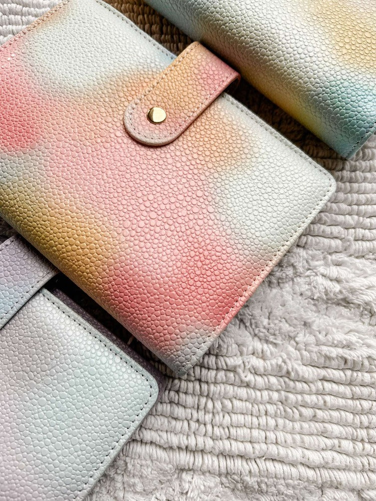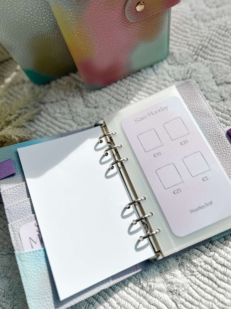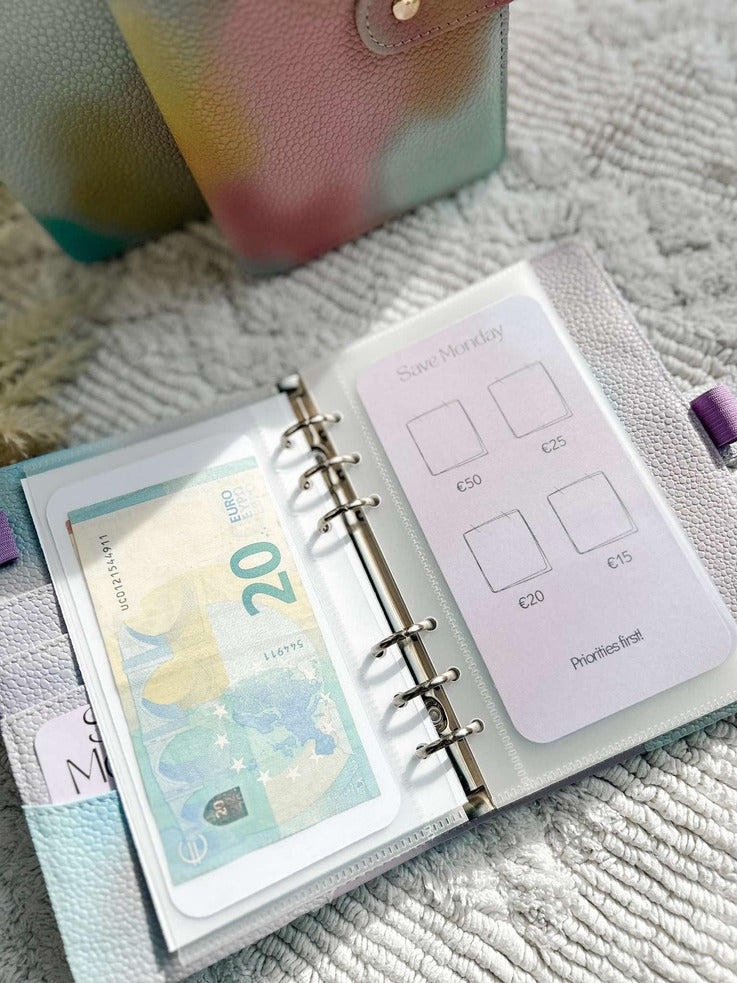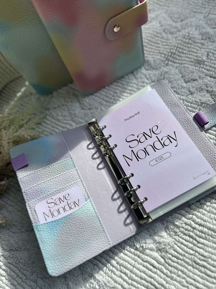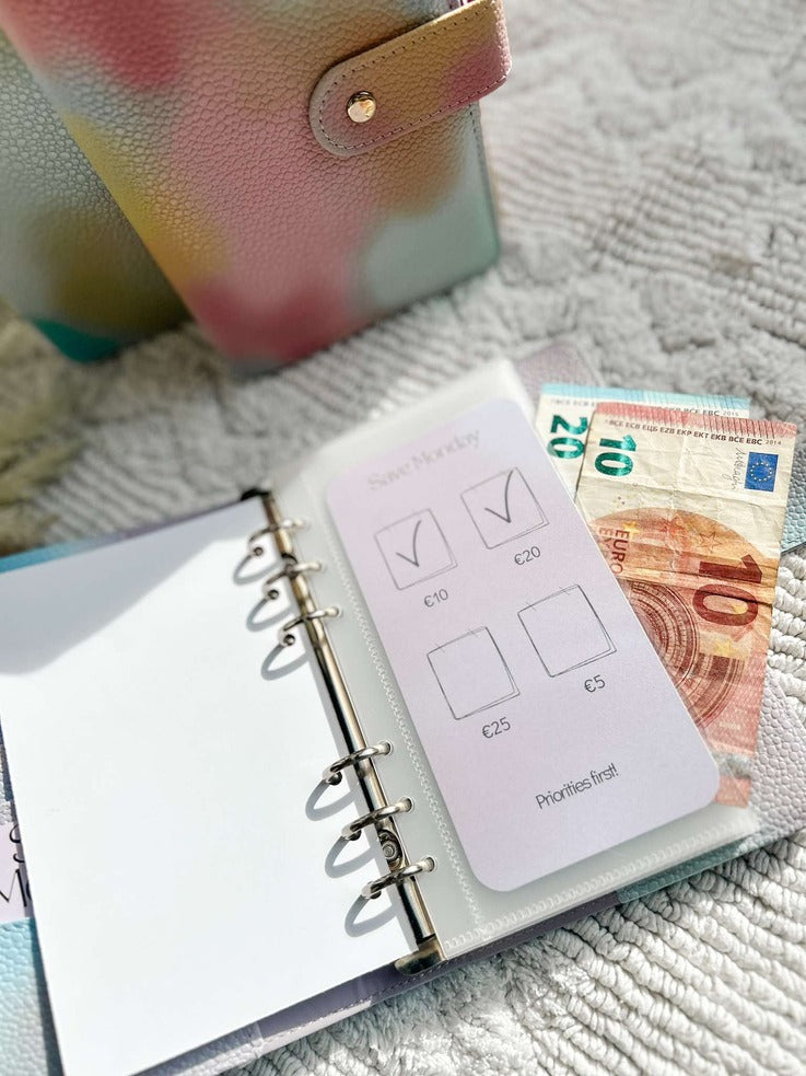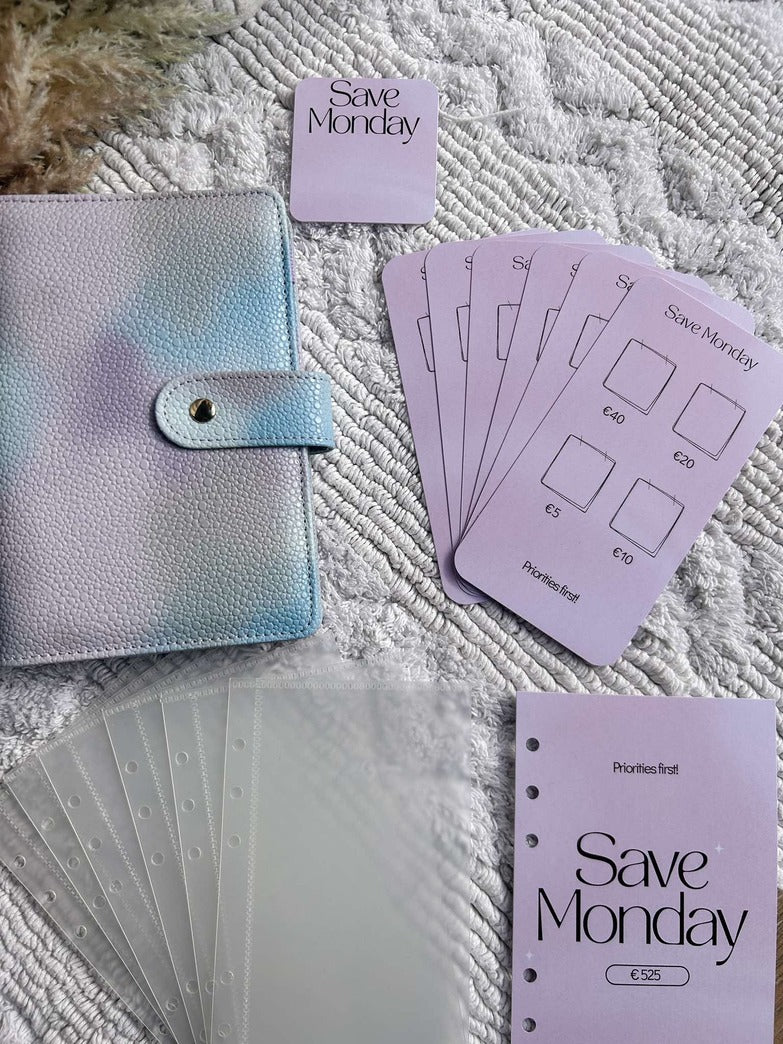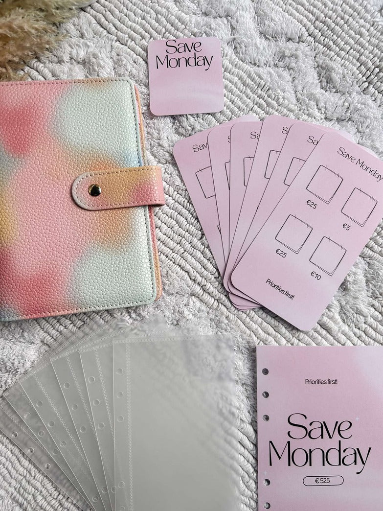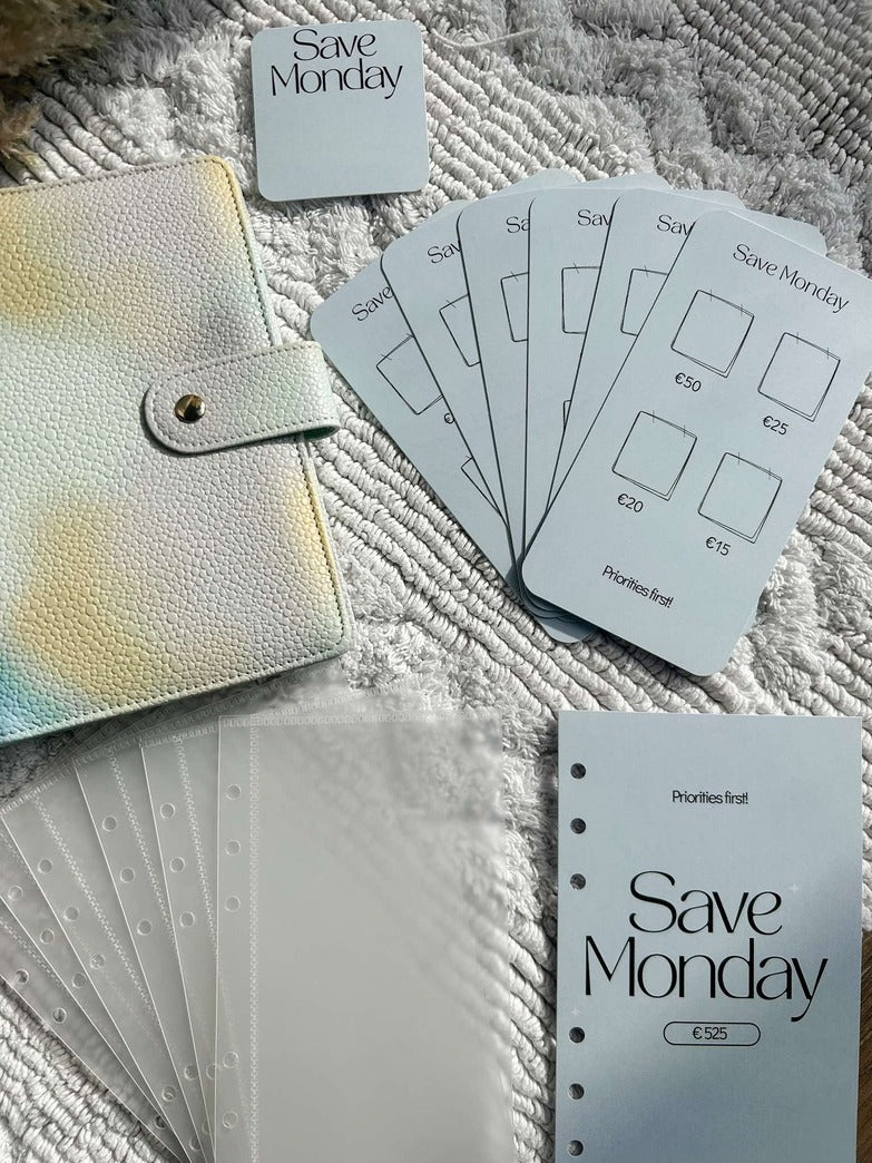 Een A6 map met de Save Monday Challenge (kleur te kiezen), 1 voorblad, 6 open enveloppes met 6 voorgedrukte kaartjes waar de bedragen op staan. Kleine extra: een leuk kaartje met 'Save Monday' voor in de zijkant van de map.