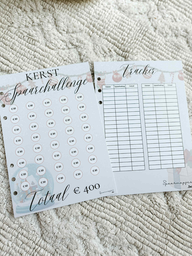 Deze spaarchallenge bestaat uit 2 stevige papieren A5 kaartjes en zijn niet herbruikbaar. Deze trackers zijn voorzien voor klanten die vorig jaar een Kerst Spaarchallenge A5 mapje (€400) kochten en deze graag terug willen vullen met 2 lege trackers.