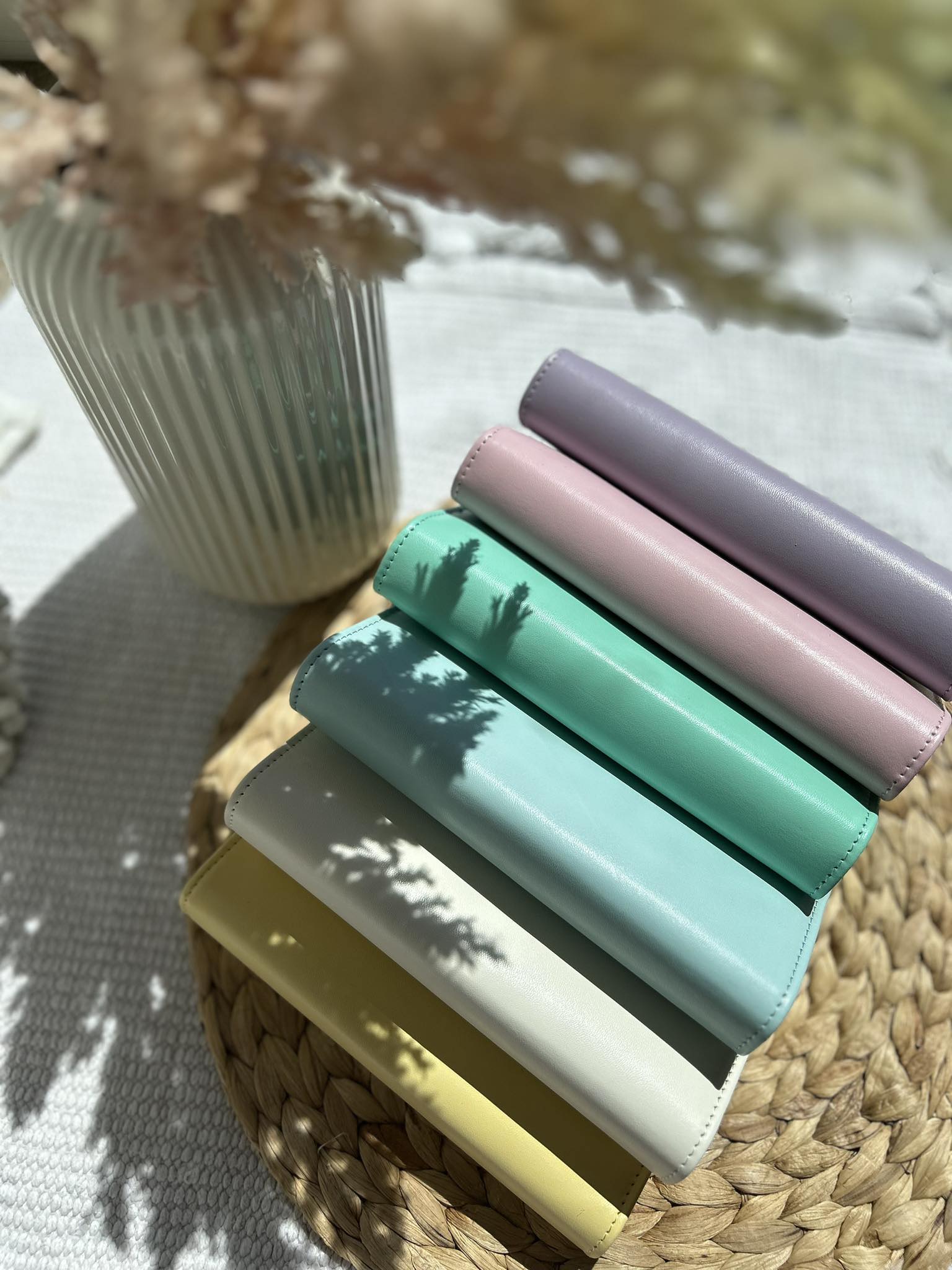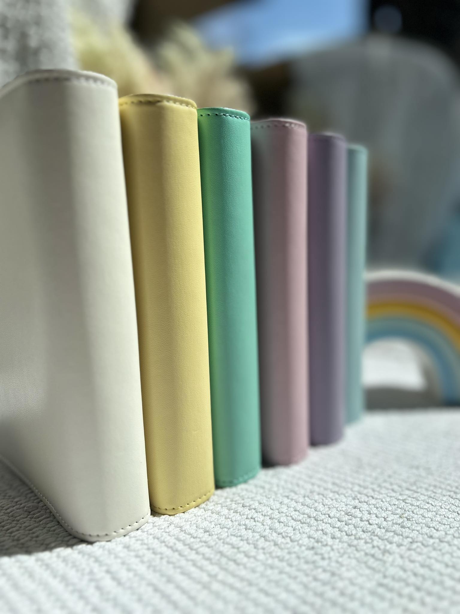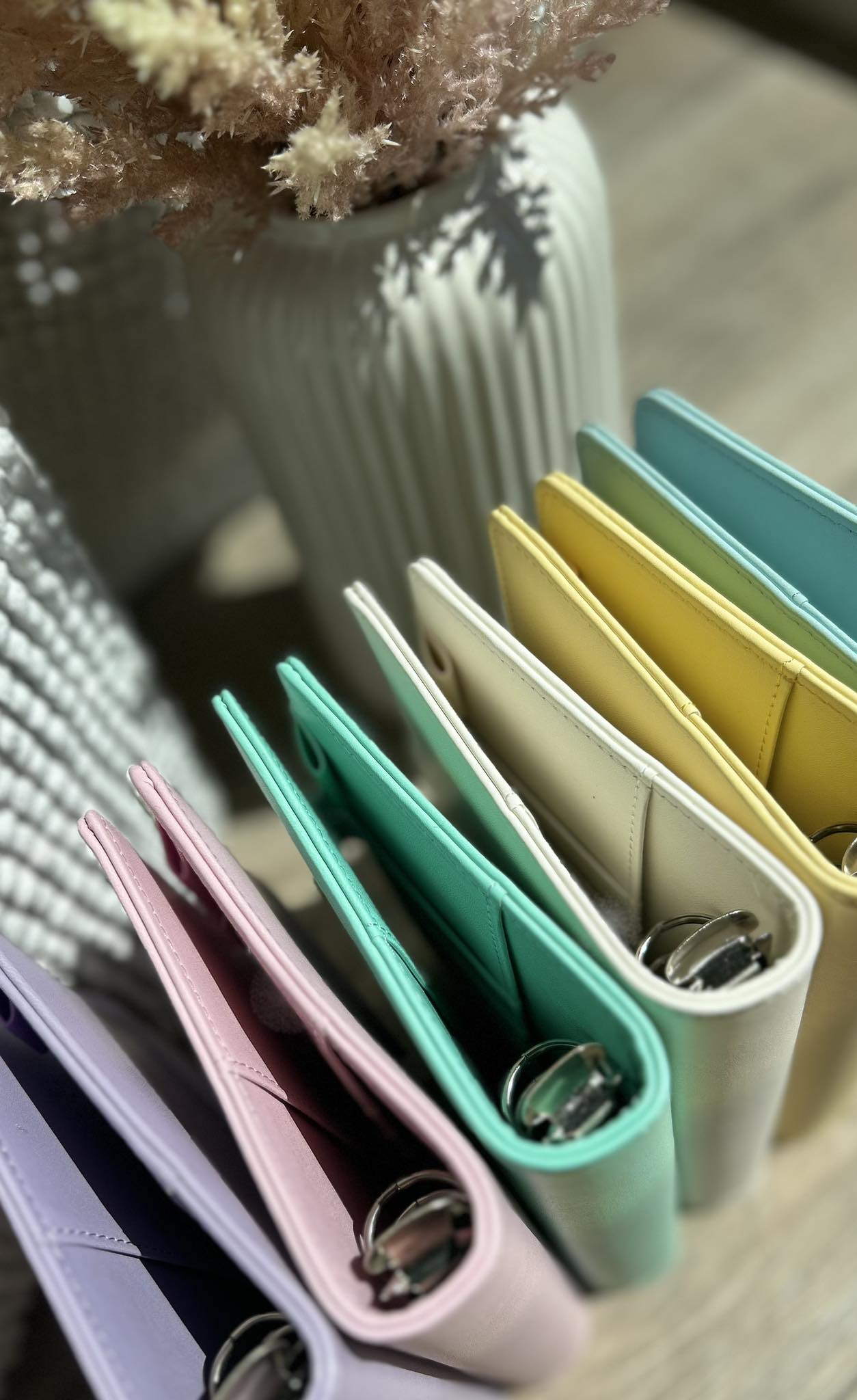 Deze A6 map met gouden ringen is beschikbaar in roze, groen, bruin, grijs, wit, zwart en paars.