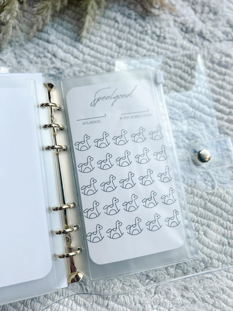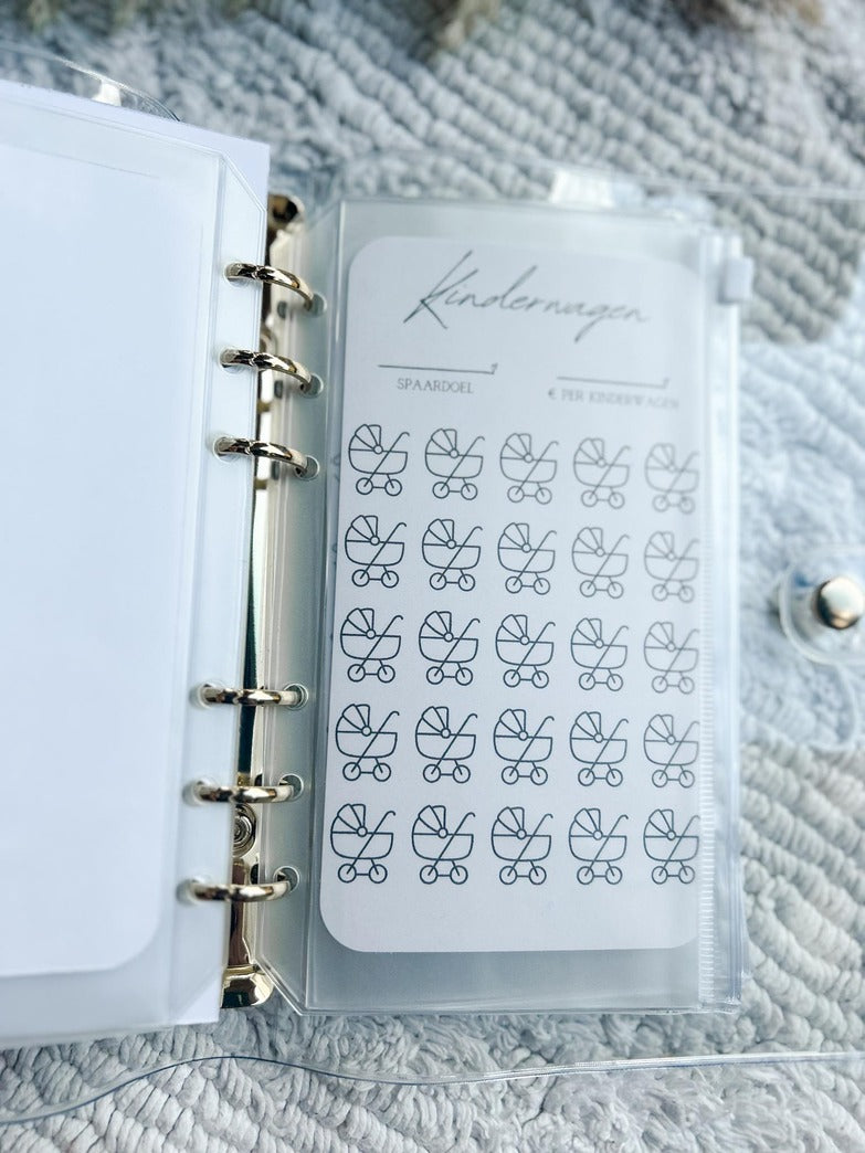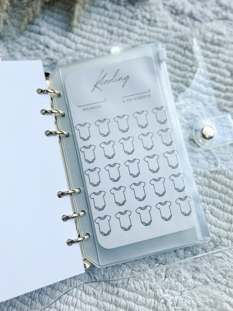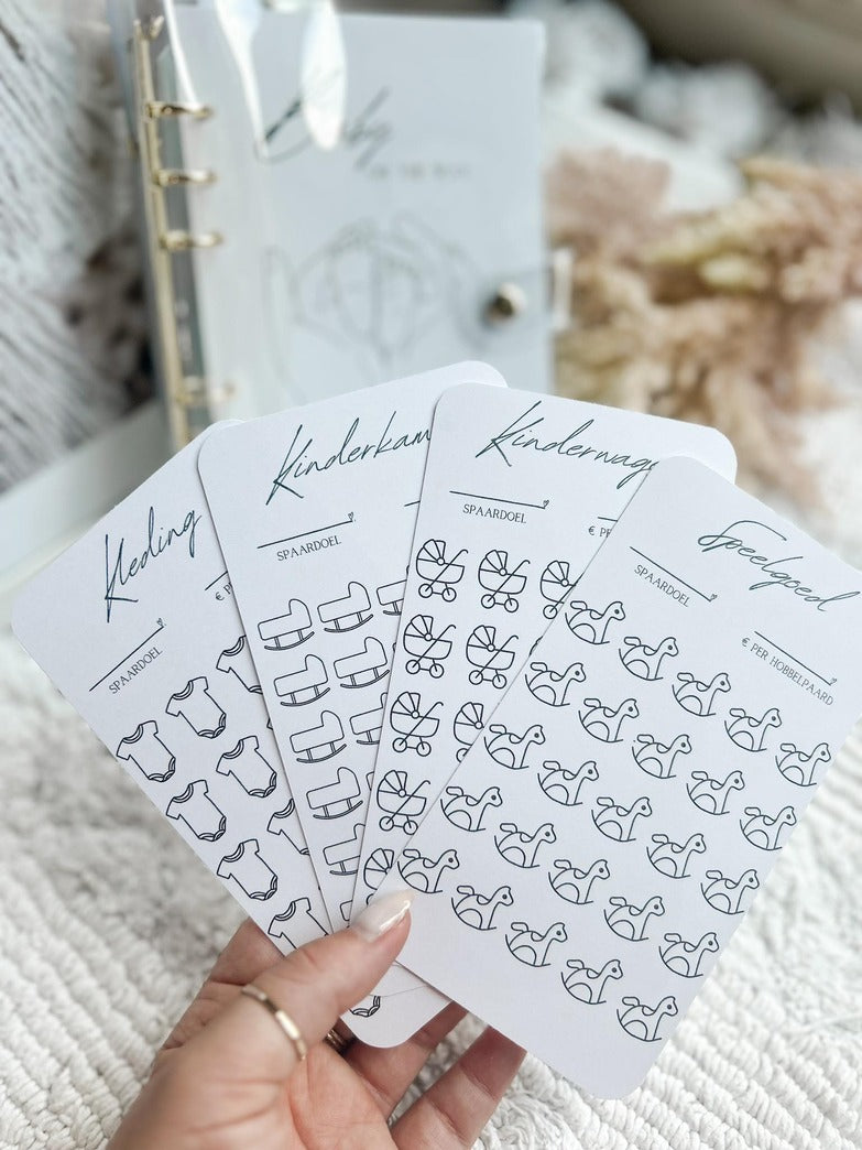 De baby spaarchallenge bevat een gouden A6 map, stevig kartonnen voorblad, 4 stevige kartonnen kaartjes en 4 ritszakjes.